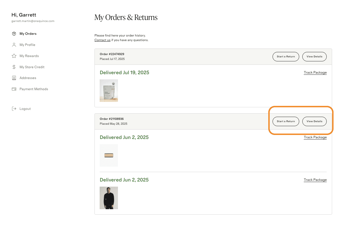 Problem: Customers initiating a return were met with a confusing and inconsistent journey. The "Start a Return" button appeared in different places on desktop and mobile, and for large orders, it was buried at the bottom of the page after a long scroll. This 'hunt for the button' was a significant point of friction that led to abandoned attempts and increased support tickets.