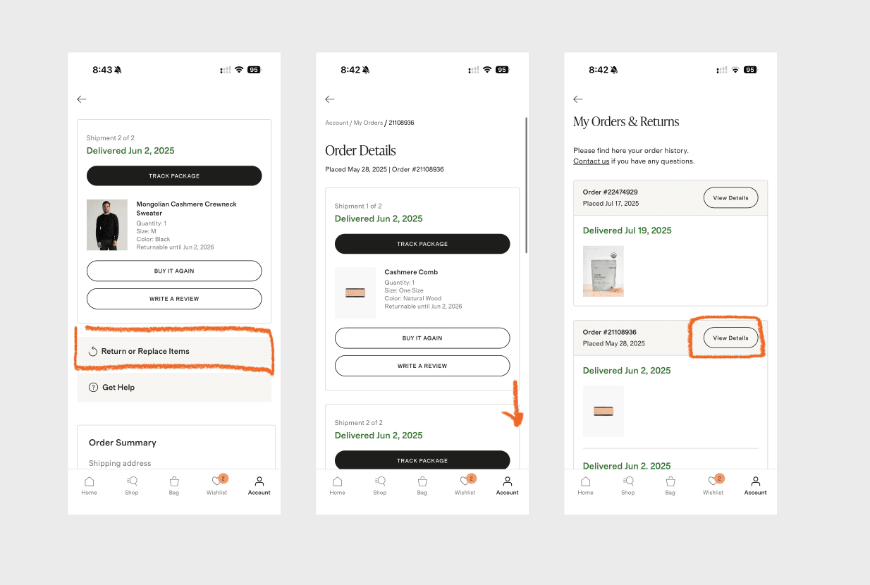 Solution: I created a single source of truth by placing a prominent, globally-accessible "Start a Return" button at the top of the order page. This consistent placement across all devices empowers customers to act with confidence and self-serve effectively.